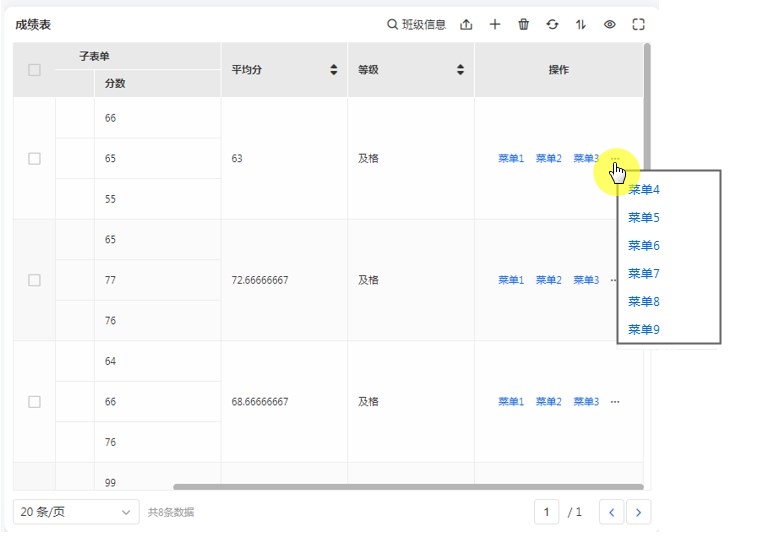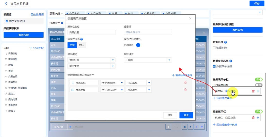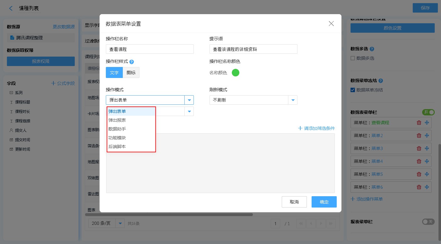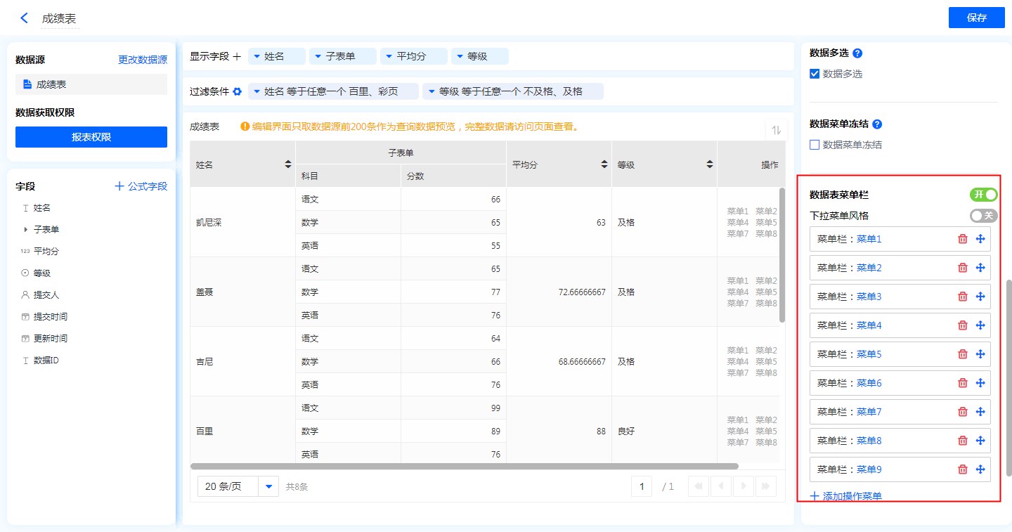 数据表支持设置数据表菜单栏,通过数据表菜单栏的扩展,在报表浏览时,可针对单条数据做出对应的操作。