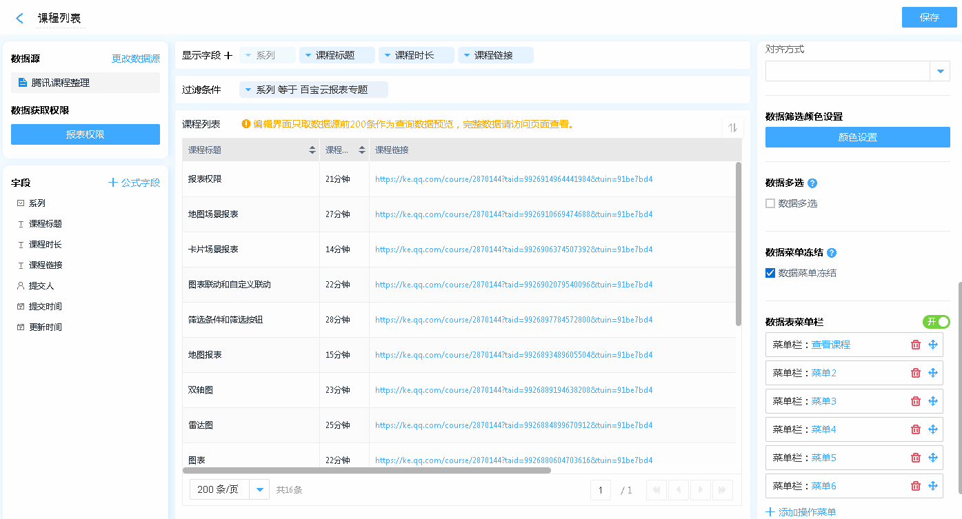 开启数据表菜单功能后,方可设置数据菜单冻结功能,开启此功能后,如当前页面无法完全显示数据菜单,可将数据菜单锁定于数据表的最右侧。