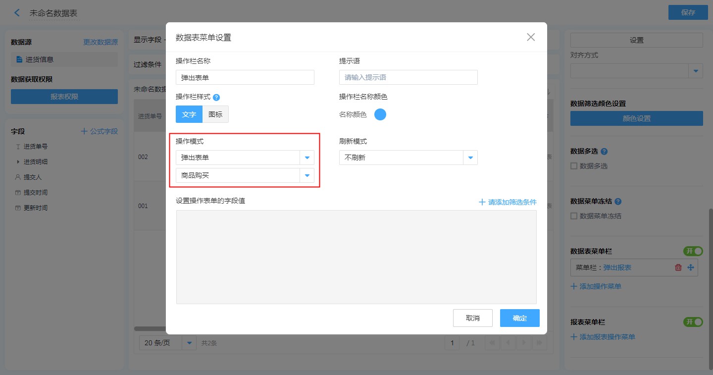 第一步:【目标报表的编辑页面】——【数据表菜单栏】——【添加操作菜单】,配置相关属性,操作模式选择【弹出表单】并选择表单,添加筛选条件,保存。