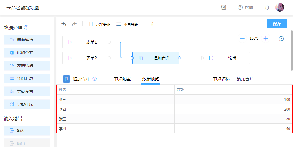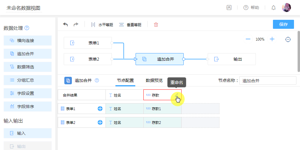常用于将两个同类型表单合并到一张表里,默认将同类型同名字段合并为一列,对于同类型字段可以手动拖拽合并为一列。