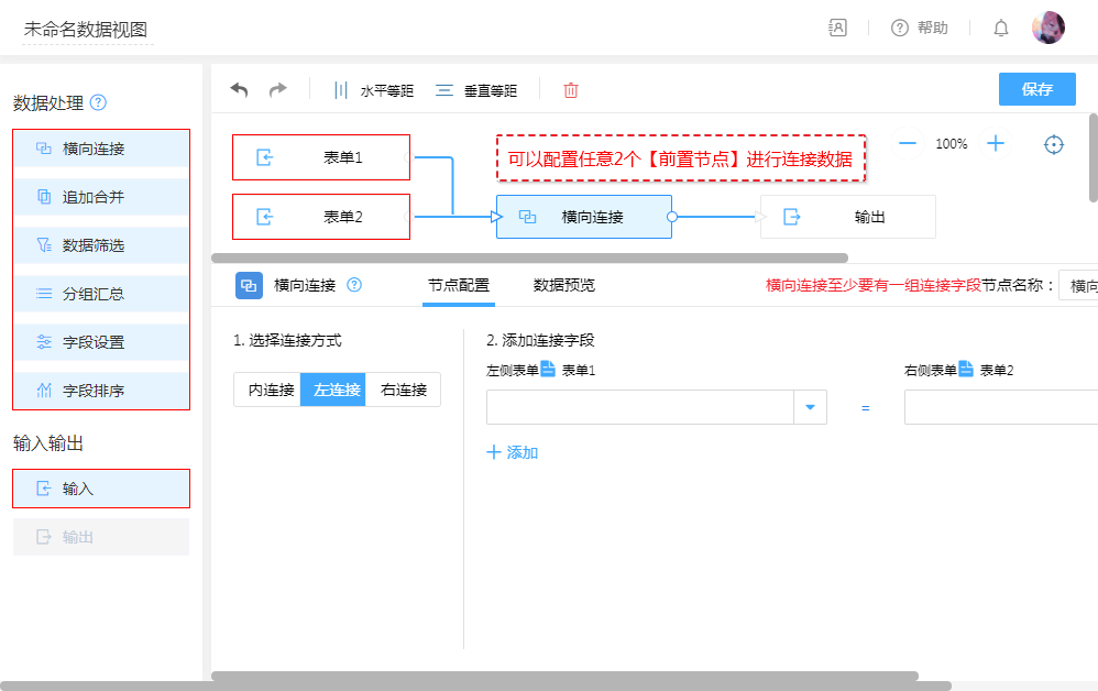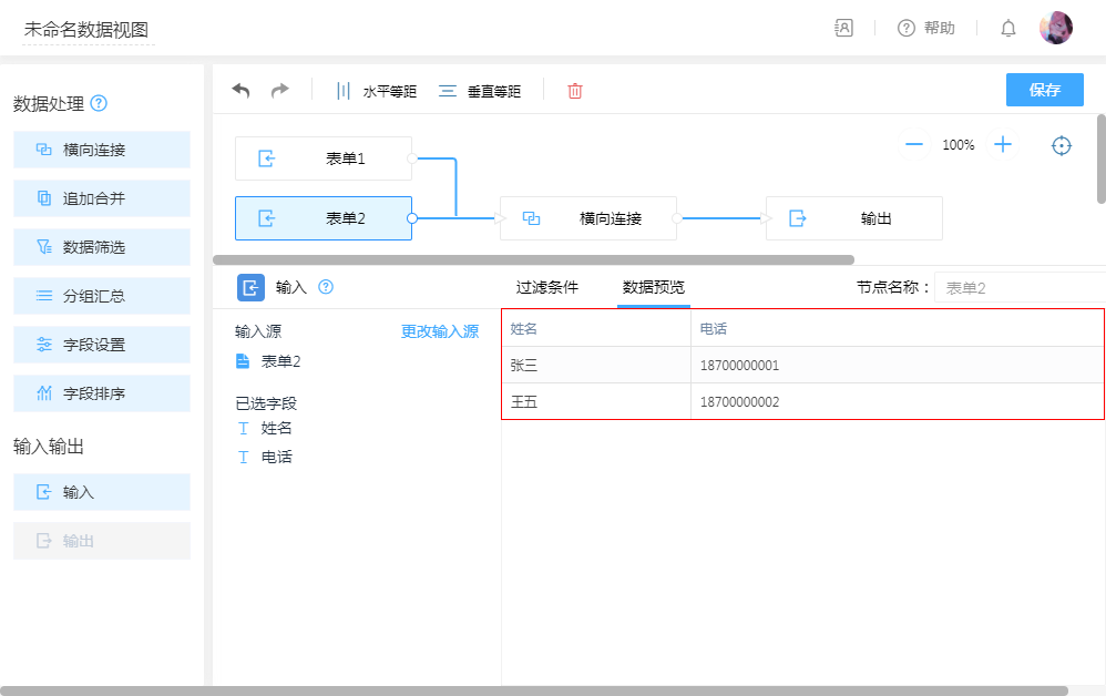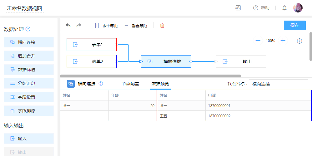 左连接:以“表单1”为主,根据“连接字段”为条件匹配“表单2”,条件字段值相同的数据将进行拼接,条件不符则忽略“表单2”的数据。