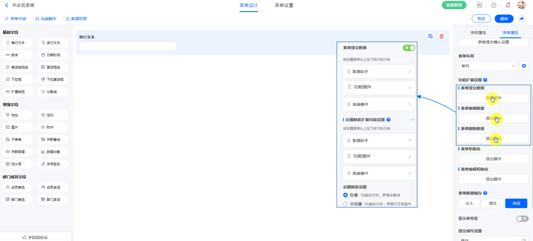 表单进行提交、编辑、删除数据操作时,即可触发所配置的数据助手。