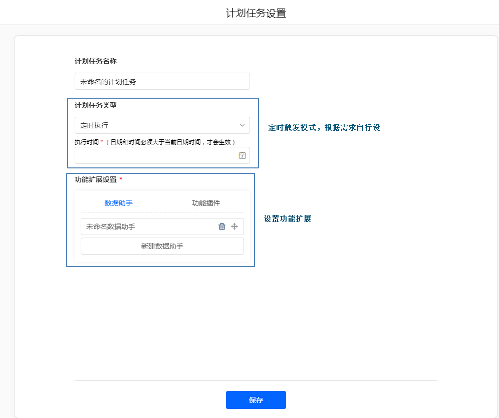 定时发起一个任务,可以配置“数据助手”定时触发执行,或循环时间触发执行。