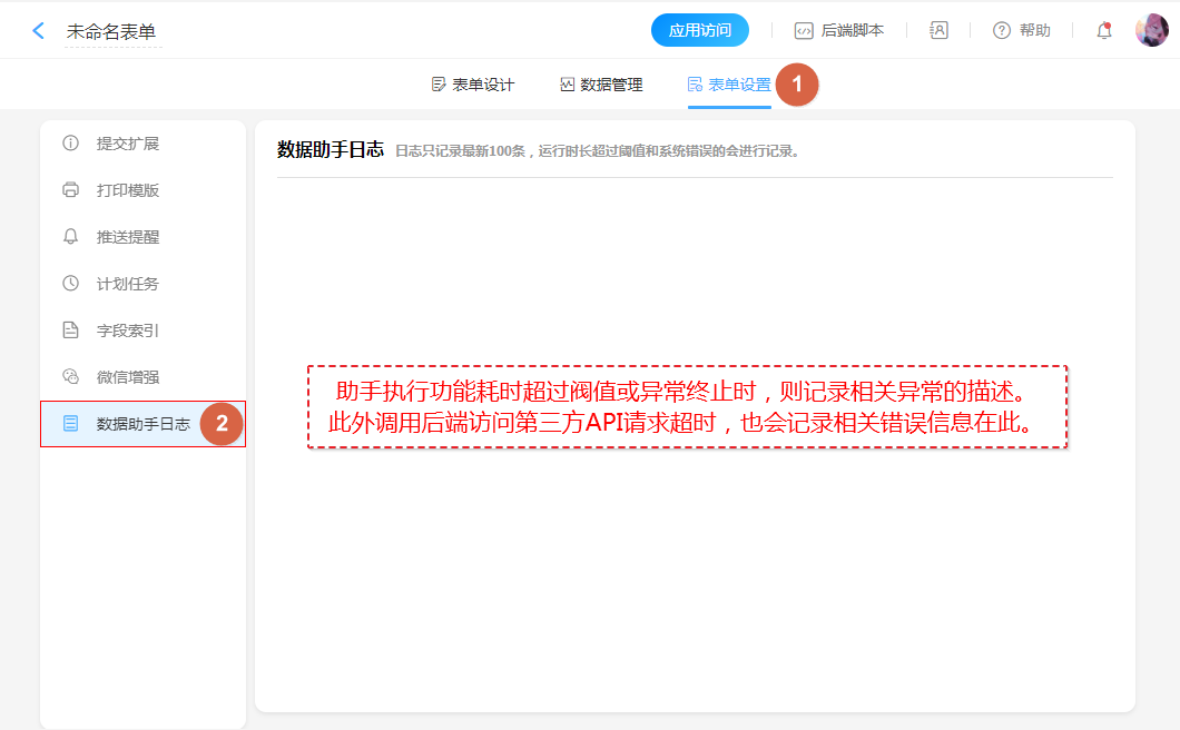 助手执行功能耗时超过阀值或异常终止时,则记录相关异常的描述。