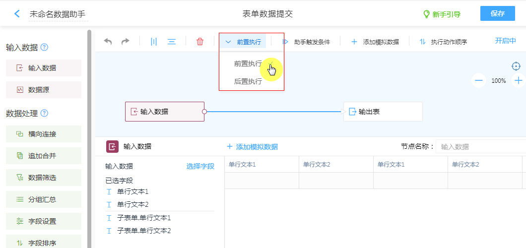 先进行表单操作,后再执行助手功能。(比如提交本次数据后,再后置触发对新增数据进行二次修改)