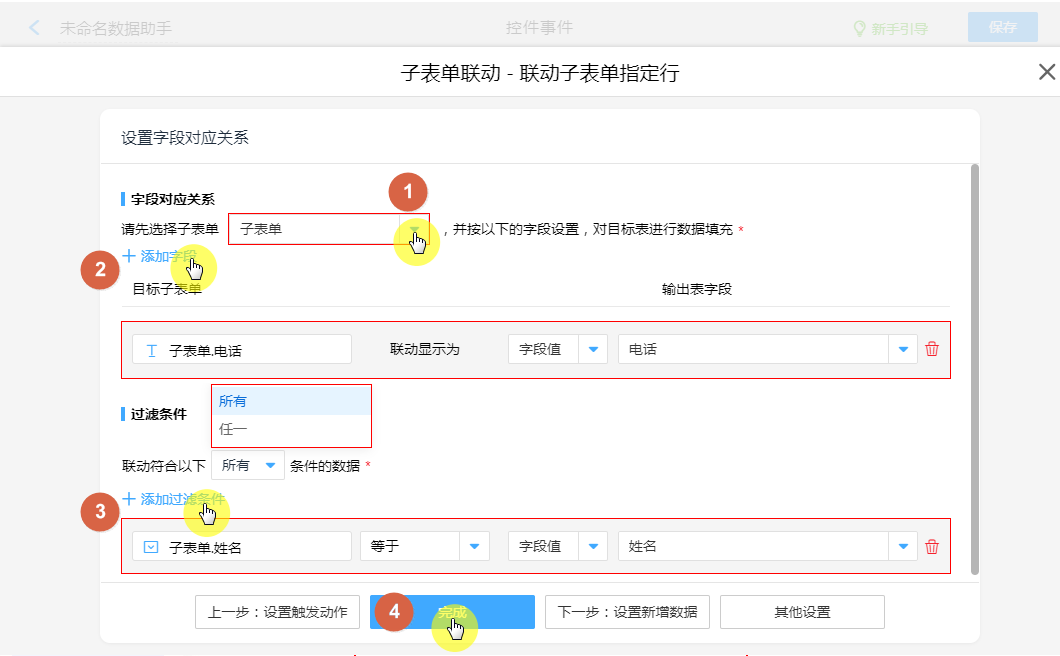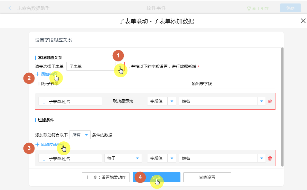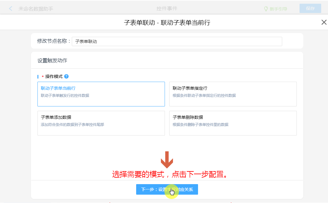 创建“子表单联动”动作节点,即可配置把“输出表”的数据,返回当前表子表单。